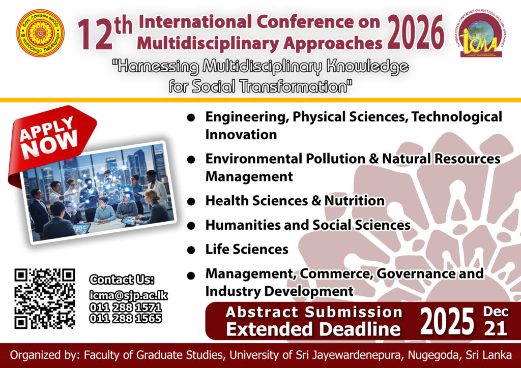 The Faculty of Graduate Studies (FGS) of the University of Sri Jayewardenepura is the official coordinating body for postgraduate academic and research activities. With its purview, FGS organizes International Conference on Multidisciplinary Approaches (iCMA) to provide a forum for academics and industry professionals engaged in multidisciplinary research & development. This is an opportunity for them to share knowledge and experiences towards national and global development.