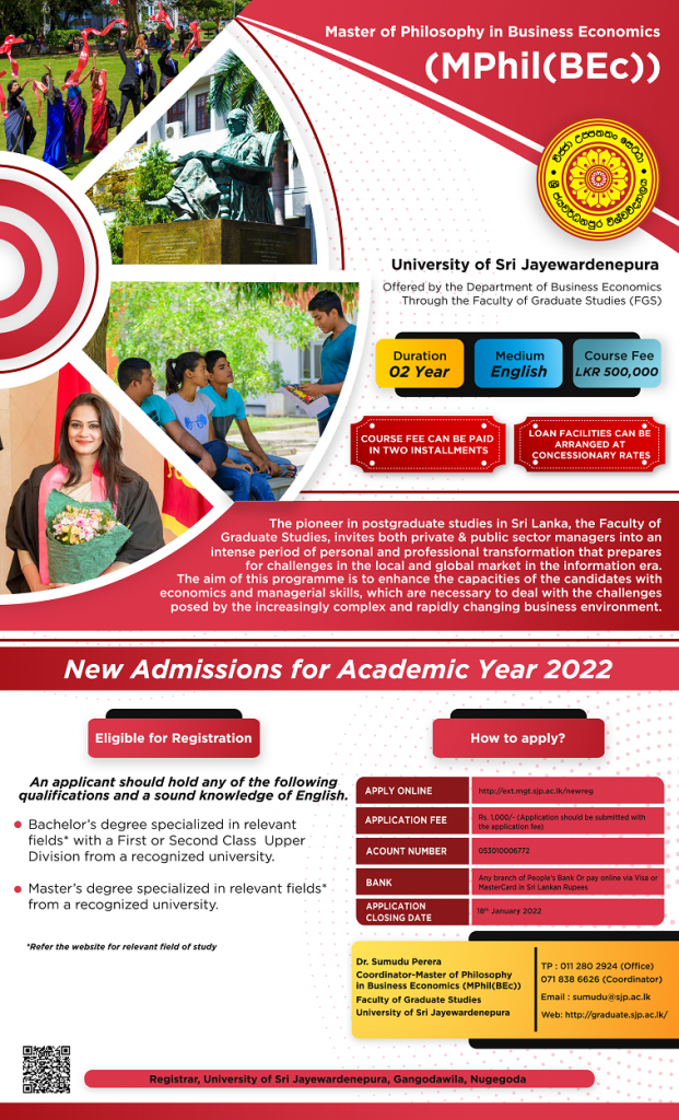 - Post the printed application (from 4th step above) along with the certified documents included in the above 8th step through a registered post to Assistant Registrar, Faculty of Graduate Studies, University of Sri Jayewardenepura, Gangodawila, Nugegoda.