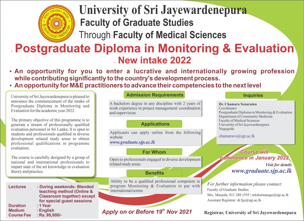 University of Sri Jayewardenepura is pleased to announce the commencement of the intake of Postgraduate Diploma in Monitoring and Evaluation for the academic year 2022.