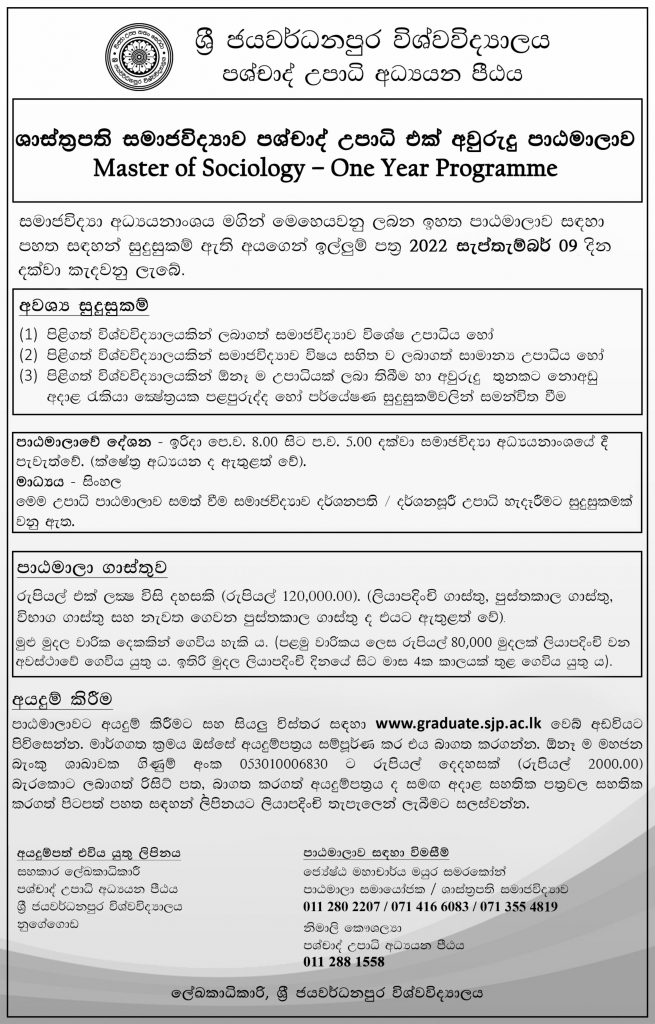 ලියුම් කවරයේ ඉහළ වම් කෙළවරේ “ශාස්ත්රපති සමාජවිද්යාව පශ්චාද් උපාධි එක් අවුරුදු පාඨමාලාව 2023” ලෙස ලියා දක්වන්න. - එමෙන්ම, ඉහත අංක 8හි උඩුගත (upload) කළ ලේඛනවල මෘදු පිටපත් (soft copies) bosss.fgs@sjp.ac.lk යන විද්යුත් ලිපිනයට යොමු කරන්න. “Master of Sociology 2023” ලෙස email subject හි සඳහන් කරන්න.
