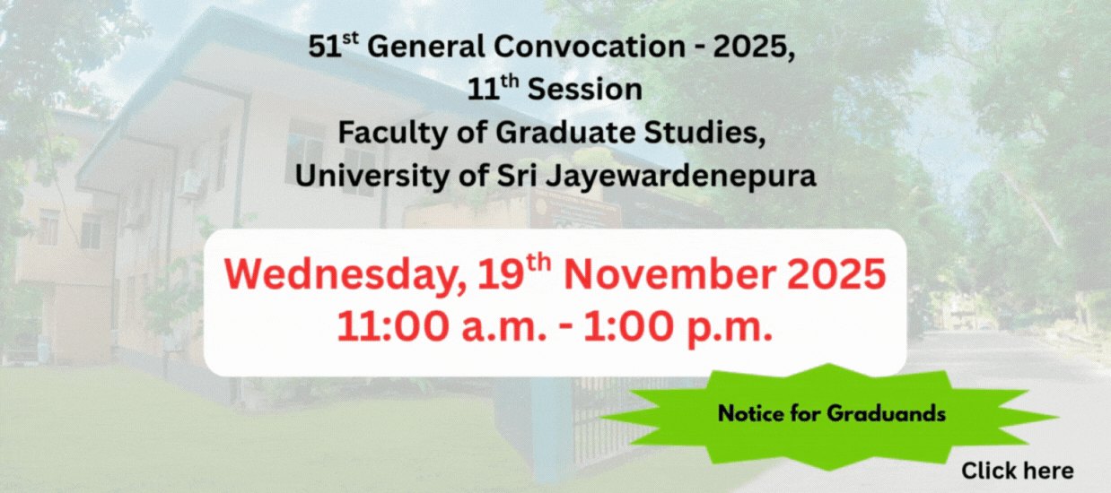 The Post Graduate faculty situated in the same premises of the University of Sri Jayewardenepura provides an ideal environment for intellectual activities, particularly in interdisciplinary areas. Its strategic location at close proximity to both Colombo and Sri Jayewardenepura facilitates obtaining the services of the experts from both the government and the private sector institutions amicably to enrich its programmes while obtaining services from academic staff members with postgraduate qualifications from some of the best universities in the world.