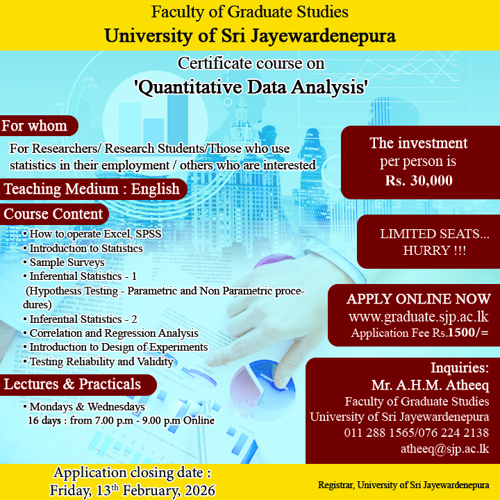 Our experienced lecturers, who are experts from the Department of Statistics and the Department of Decision Science at the University of Sri Jayewardenepura, will guide you through each step of the data analysis process. You’ll also gain hands-on experience using statistical software packages such as Excel, SPSS, and Minitab, allowing you to apply your knowledge in a practical setting.