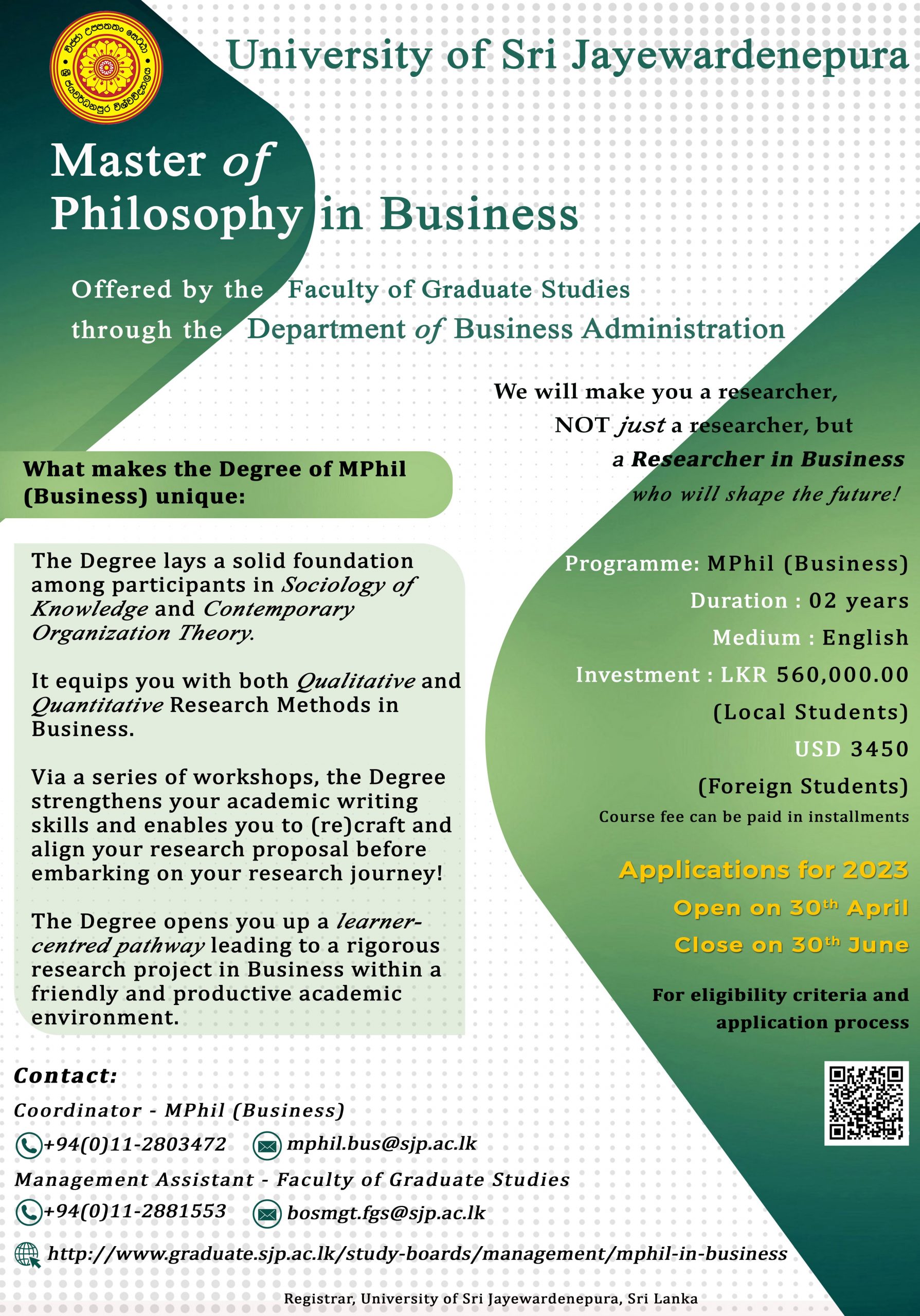 Applications are invited from interested candidates for the Degree of MPhil (Business) offered through the Department of Business Administration, Faculty of Graduate Studies, University of Sri Jayewardenepura. MPhil (Business) is a Master’s by thesis which aims to facilitate students to acquire the necessary knowledge and skills required to be independent researchers and opens up a learner-centred pathway leading to a rigorous research project in the field of Business. Once enrolled students are required to successfully complete four non-credit taught courses and two workshop series parallel to which their research project will commence under the guidance of a supervisor.