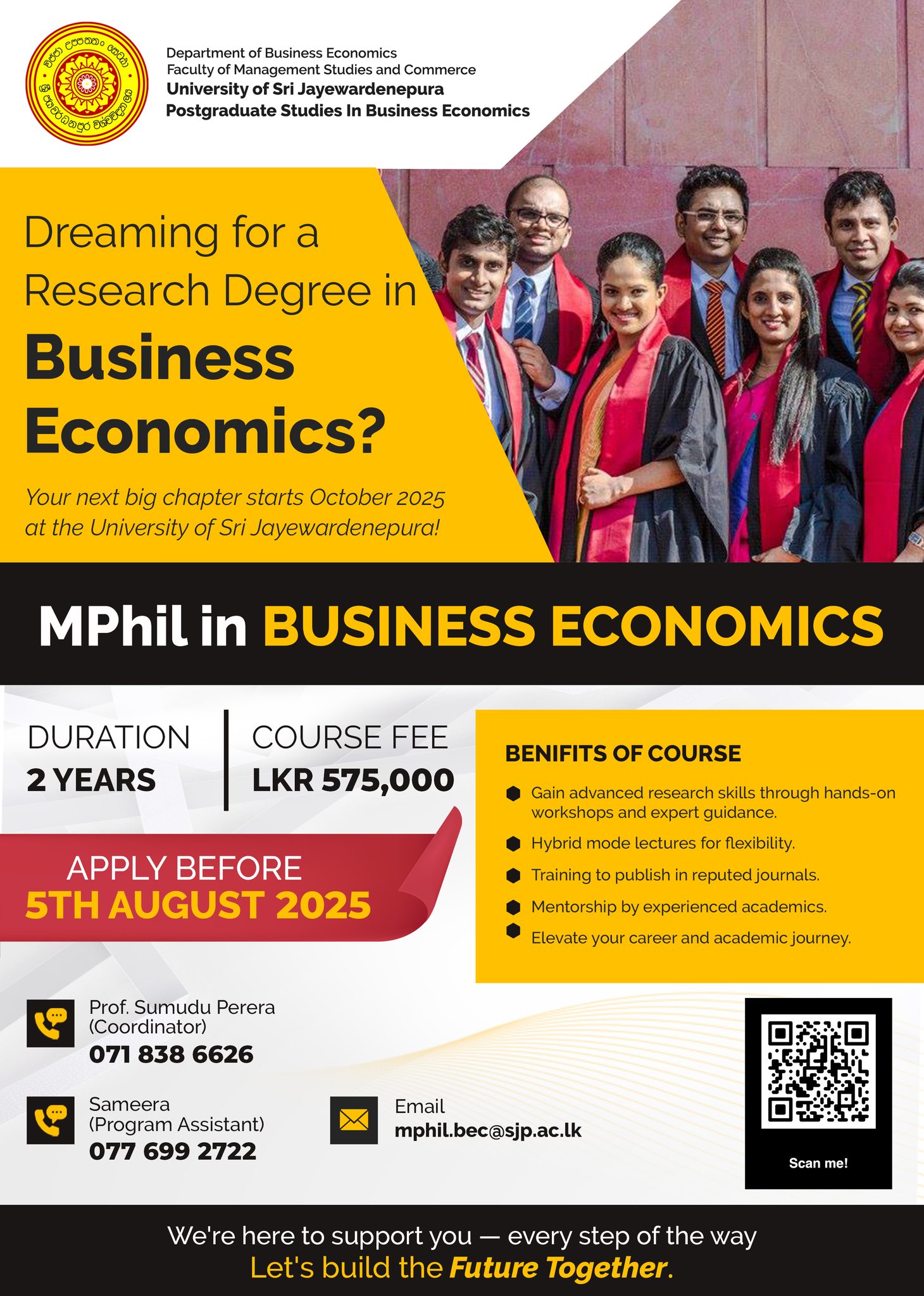 Offered by the Faculty of Graduate Studies, University of Sri Jayewardenepura (USJ) through the Department of Business Economics, USJ, new admissions for the Master of Philosophy in Business Economics (MPhil(BEc)) are now open for the Academic Year 2025 – October Intake.