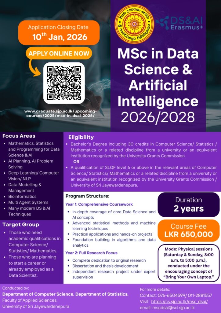Applications are invited from interested candidates for the MSc in Data Science and Artificial Intelligence (SLQF 10) offered by the Department of Computer Science and Department of Statistics, University of Sri Jayewardenepura. This program has been designed for graduates with basic knowledge in Computer Science/Statistics/Mathematics to provide them with an opportunity to further develop their knowledge in Data Science and Artificial Intelligence.