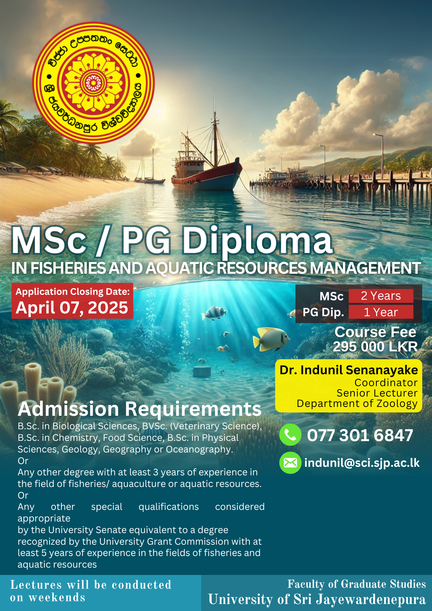 Please write “MSc/PGD in Fisheries and Aquatic Resources Management 2024” in the subject field of the email. - Post the printed application (from 4th step above) along with the certified documents included in the above 8th step through a registered post to Senior Assistant Registrar, Faculty of Graduate Studies, University of Sri Jayewardenepura, Gangodawila, Nugegoda.
