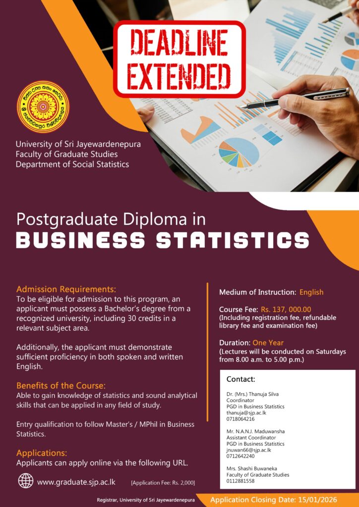 Send the downloaded application (from the 4th step above) to bosss.fgs@sjp.ac.lk. Please write “PGD in Business Statistics – 2026” in the subject field of the email.