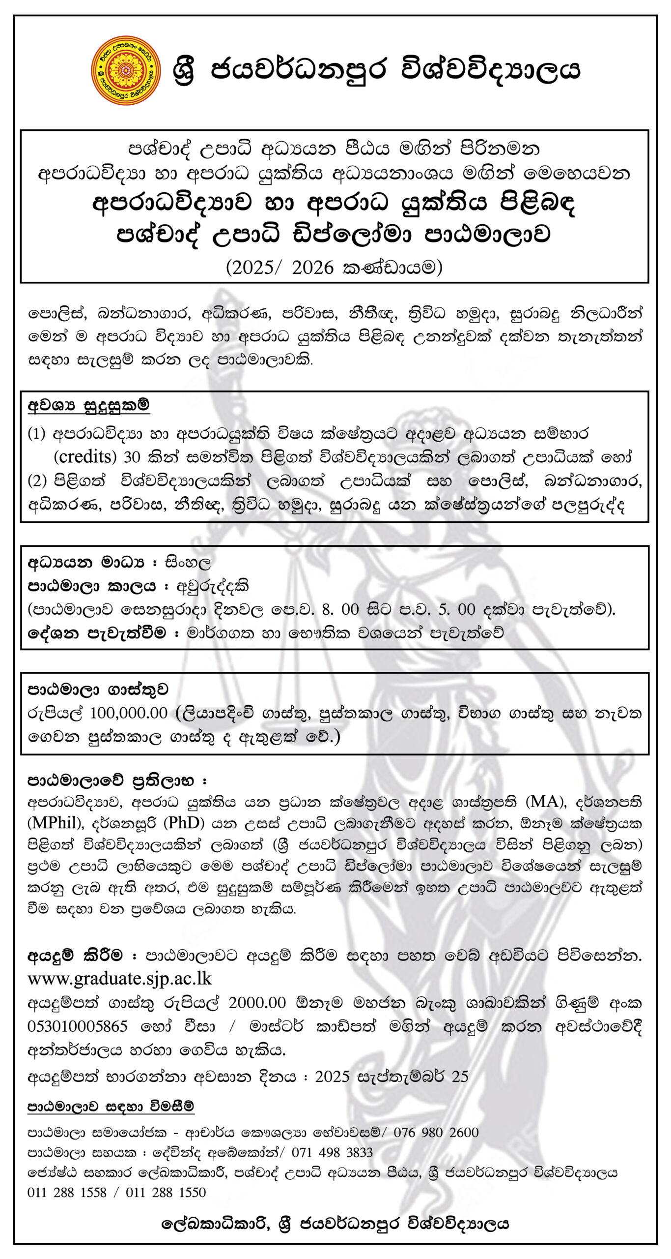 අපරාධවිද්යාව හා අපරාධ යුක්තිය පිළිබඳ පශ්චාද් උපාධි ඩිප්ලෝමා පාඨමාලාව (2025/2026 කණ්ඩායම)