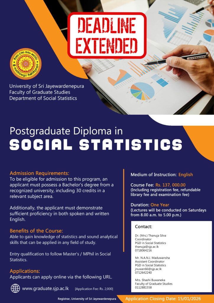 Send the downloaded application to bosss.fgs@sjp.ac.lk. Please write “PGD in Social Statistics – 2026” in the subject field of the email.
