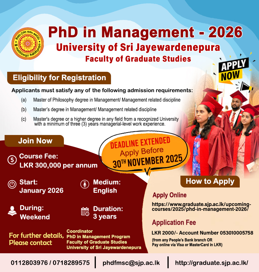 - Post the printed application (from the 4th step above) along with the certified documents included in the above 8th step through a registered post to the Senior Assistant Registrar, Faculty of Graduate Studies, University of Sri Jayewardenepura, Gangodawila, Nugegoda.