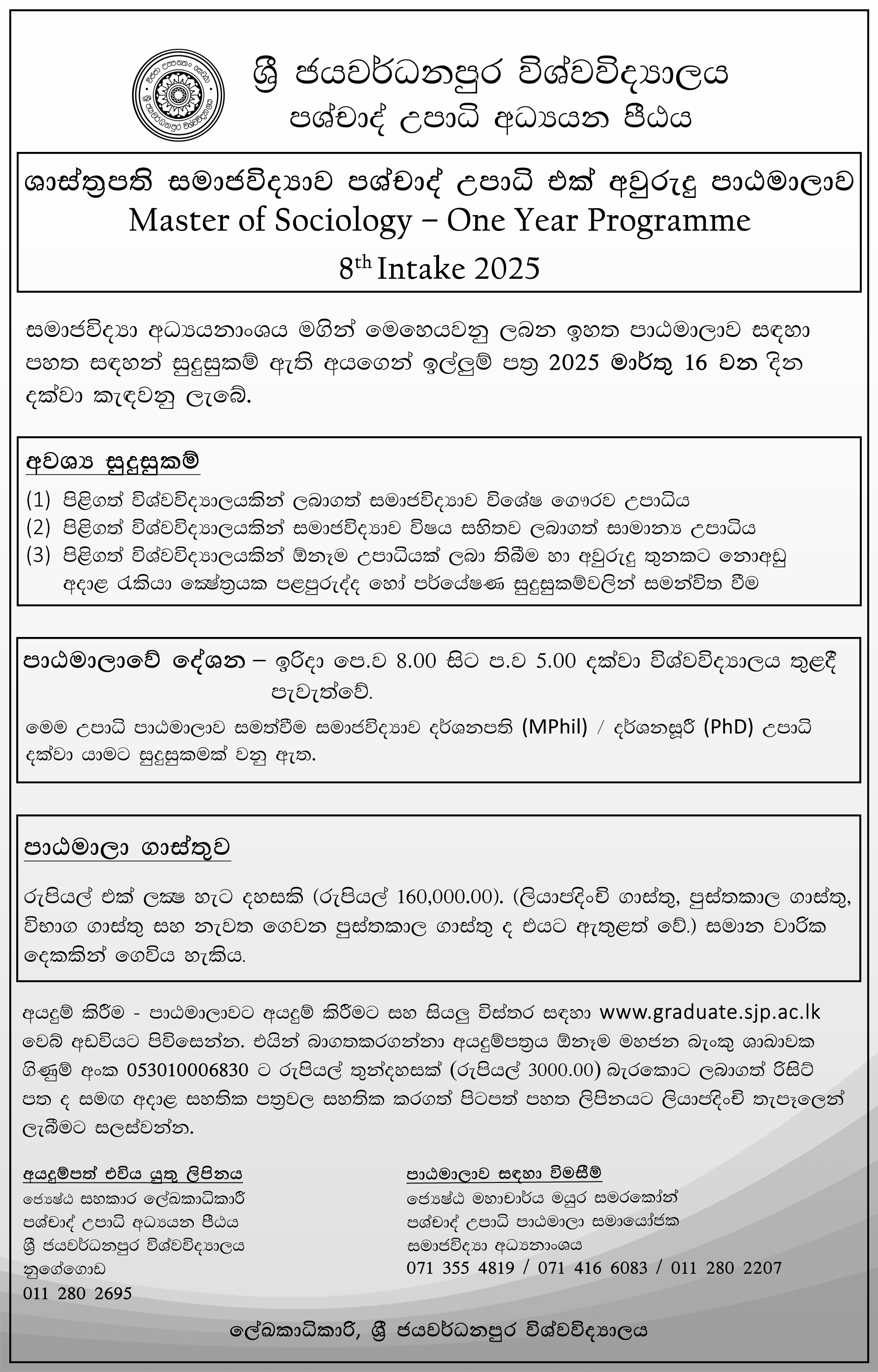 ලියුම් කවරයේ ඉහළ වම් කෙළවරේ “ශාස්ත්රපති සමාජවිද්යාව පශ්චාද් උපාධි එක් අවුරුදු පාඨමාලාව – 2025” ලෙස ලියා දක්වන්න. - එමෙන්ම, ඉහත අංක 8හි උඩුගත (upload) කළ ලේඛනවල මෘදු පිටපත් (soft copies) bosss.fgs@sjp.ac.lk යන විද්යුත් ලිපිනයට යොමු කරන්න. “Master of Sociology – 2025” ලෙස email subject හි සඳහන් කරන්න.